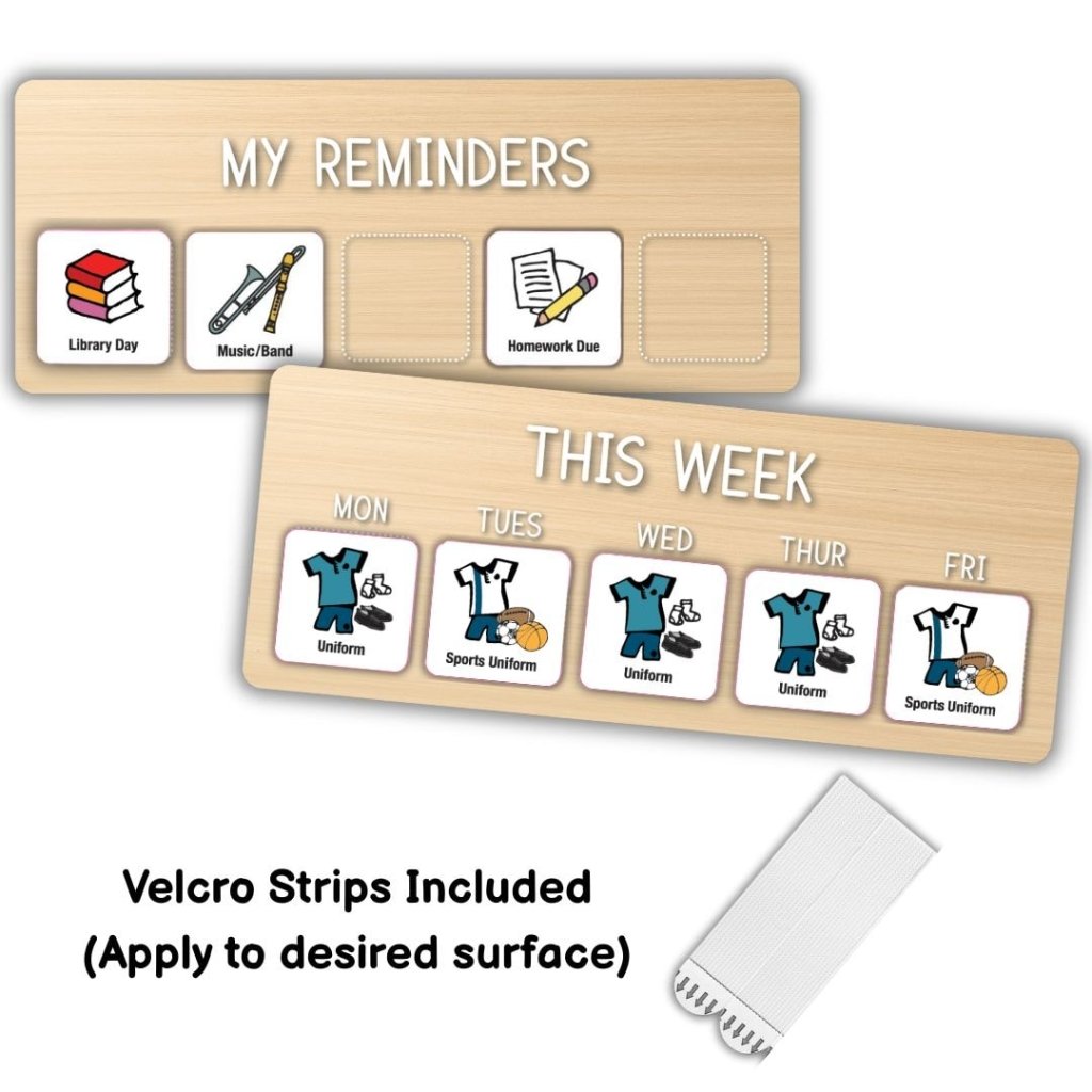 This set includes 2 x timber boards so that you can view both "My Week" and "My Reminders" to create a simple, easy-to-use visual reminder system for everyday school routines. One board can be used to set out Formal & Sports Uniform days and the second used for daily prompts/reminders!